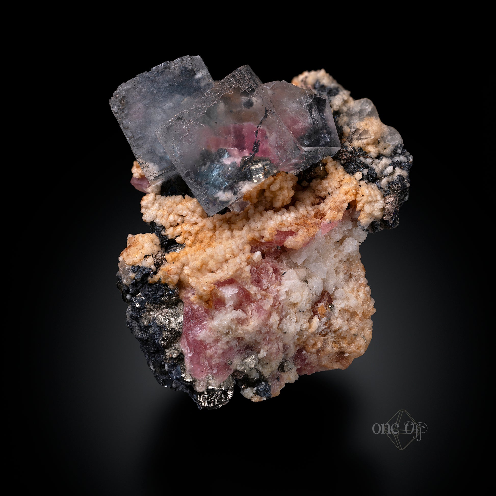 Fluorite w/ Rhodochrosite, Silver & Chalcopyrite
